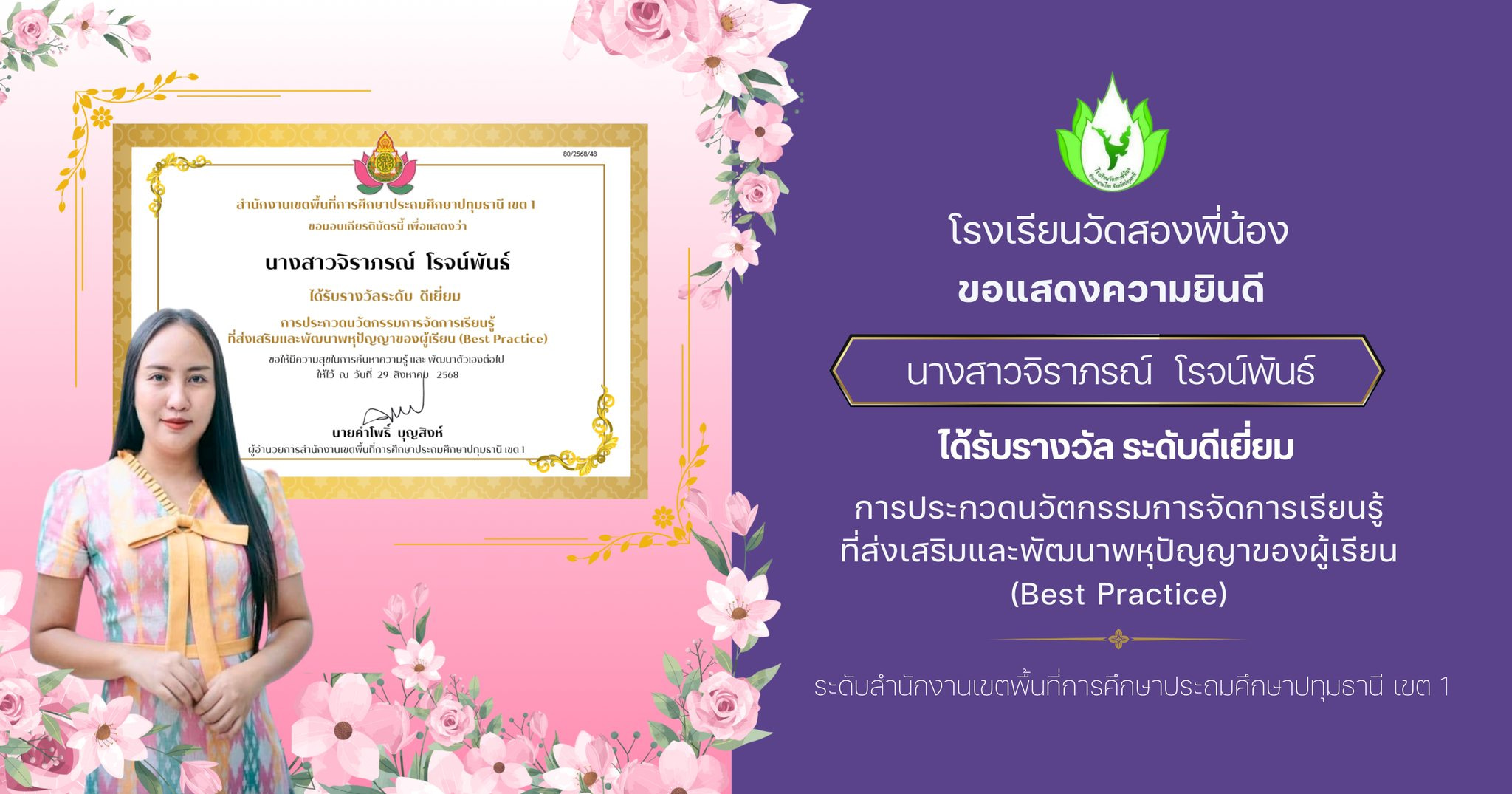ชื่อผลงาน : ได้รับรางวัล ระดับดีเยี่ยม การประกวดนวัตกรรมการจัดการเรียนรู้ที่ส่งเสริมและพัฒนาพหุปัญญาของผู้เรียน (Best Practice) สำนักงานเขตพื้นที่การศึกษาประถมศึกษาปทุมธานี เขต 1