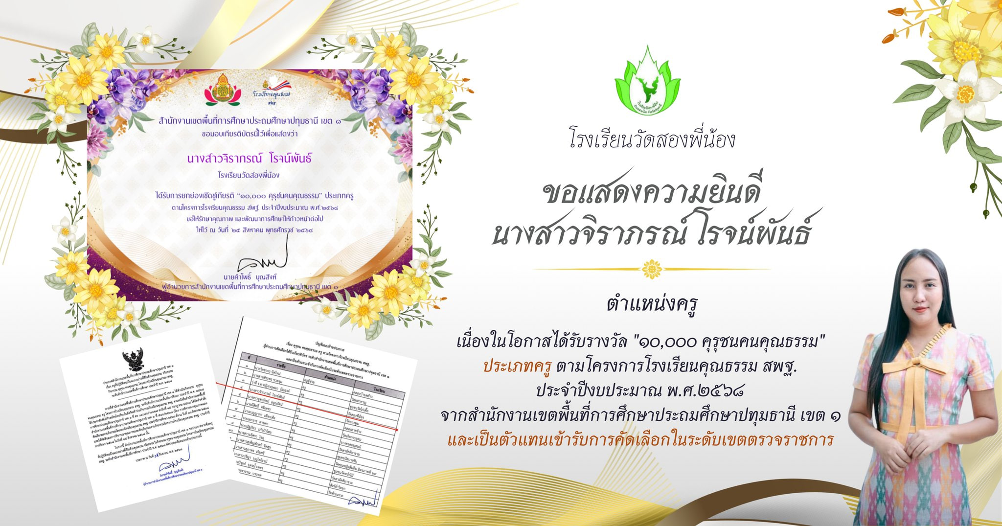 ชื่อผลงาน : ได้รับรางวัล "10,000 คุรุชนคนคุณธรรม" ประเภทครู ตามโครงการโรงเรียนคุณธรรม สพฐ. ประจำปีงบประมาณ พ.ศ.๒๕๖๘ จากสำนักงานเขตพื้นที่การศึกษาประถมศึกษาปทุมธานี เขต 1 และเป็นตัวแทนเข้ารับการคัดเลือกในระดับเขตตรวจราชการ